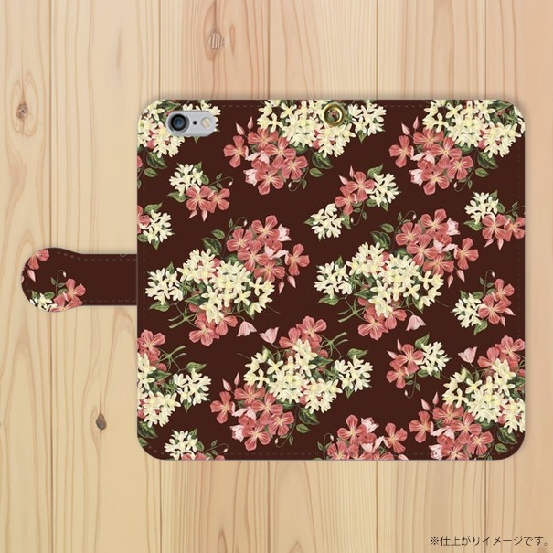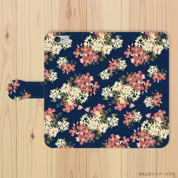 濃紺ベースに花の絵柄の女性向けの手帳型スマホケースです。